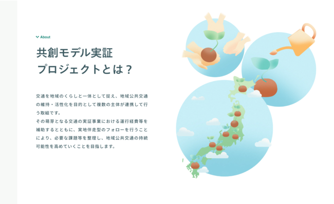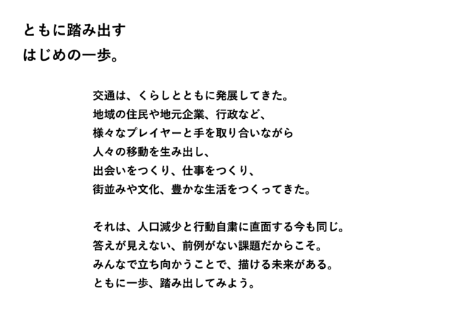 次世代の地域交通を生み出す「共創モデル実証プロジェクト」を開始しました。株式会社ニューピースでは、「共創モデル実証プロジェクト」のHP作成やコピー策定などのプロデュースを行いました。