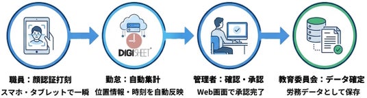 湯浅町教育委員会は、学校現場で求められる多様な働き方に対応するため、ICTを活用した業務改善を段階的に進めています。顔認証打刻システム「DigiFaceAI」と、労務管理システム「DigiSheet」の導入により、教職員の方々は正確で簡単に勤怠手続可能となり、教育活動に専念できる環境が整備されました。