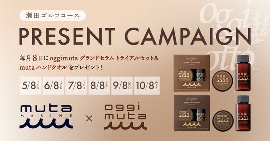 2025年5月8日より毎月8日、瀬田ゴルフコースの対象プレーヤーにオッジィオットとmuta MARINE(ムータマリン)のコラボレーションによって誕生した高機能ヘアケアシリーズ『oggimuta(オッジィムータ)』のトライアルセット、及びオッジィオットとムータマリン各ブランドのオリジナルグッズをプレゼントいたします。