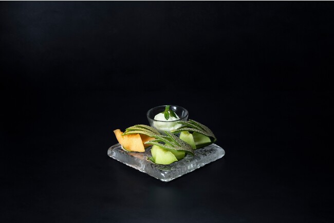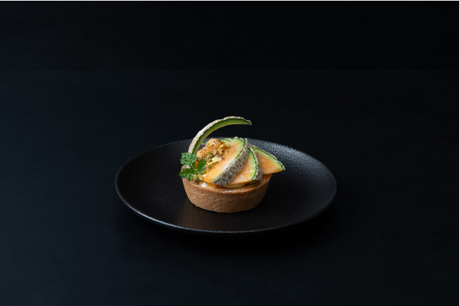 赤いメロンと青いメロンのふたつの香りが楽しめる、見た目も美しいタルトに、ピスタチオのナッツとクリーム、 生のメロンが美味しいハーモニーを奏でます。