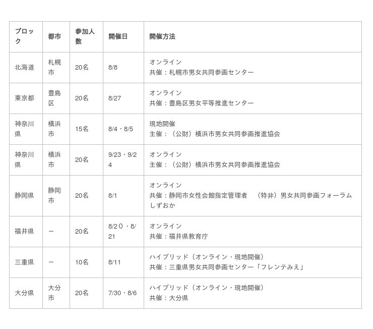 ・参加対象:開催都市に居住地がある女子及びジェンダーマイノリティの中高生(詳細は、各開催自治体・団体の募集要項をご確認ください)