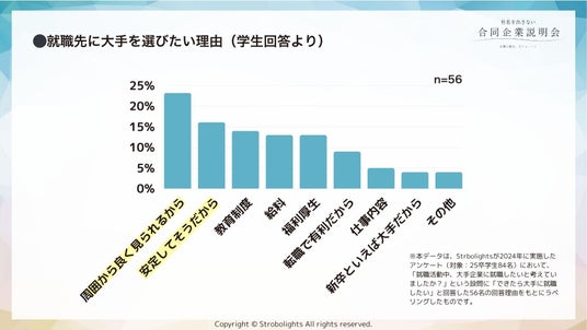 またStrobolightsが2024年に独自に実施した調査でも、「大手企業を志望する理由」に「周囲の目」や「安定イメージ」など外的要因を挙げる学生が多数で、仕事内容や理念といった内面的価値を理由に選ぶ学生は少数でした。