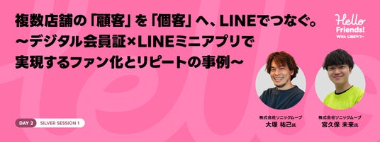 - 登壇者:株式会社ソニックムーブ 代表取締役 大塚 祐⼰、LINEビジネス事業本部 本部長 宮久保 未来
