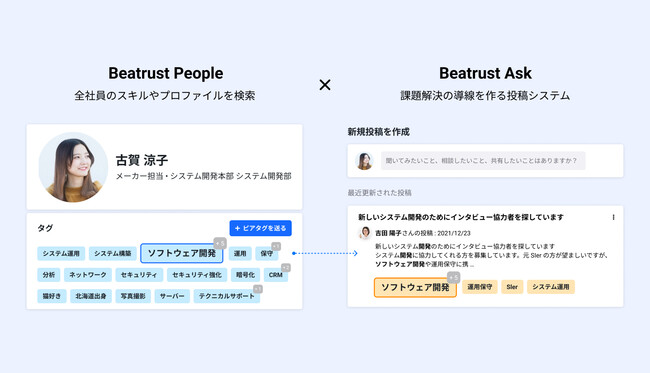 Beatrustは組織内における従業員同士の自律的な協業を促進し「タレントコラボレーション」を実現するプラットフォームです。現在 Beatrust People、Beatrust Ask という2つの機能を中心に展開されています。