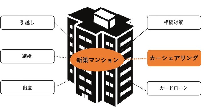 新築マンションの販売訴求にあたり、様々なデータを活用した分析を行った結果、いくつかの親和性の高いコンテンツカテゴリが導き出されました。その中でも特に顕著な特徴のあった「カーシェアリング」に関連するコンテンツへの配信を実施しました。