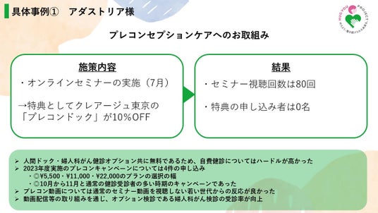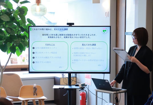 今年取り組んだ活動について、安西は「各社様と女性の健康啓発セミナーや婦人科オンライン相談会、オリジナル健診プランの作成などに取り組ませていただいたものの、想定よりもハードルが高く実施数が少なくなり、成果が見えづらい状況でした。」と報告し、「様々な取り組みによって実際に受診に繋げることが難しいという『受診への行動変容を起こすことの難しさ』について、課題が残る1年になりました。」と活動を振り返りました。