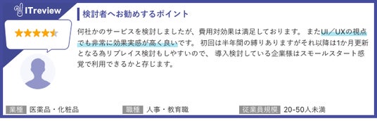 ビジネス向けIT製品・クラウドサービスのレビュープラットフォームで「ITreview(アイティレビュー)」では、集まったリアルユーザーのレビューをもとに、顧客満足度や市場での製品認知度が把握できる独自の四象限マップ「ITreview Grid」を展開しています。