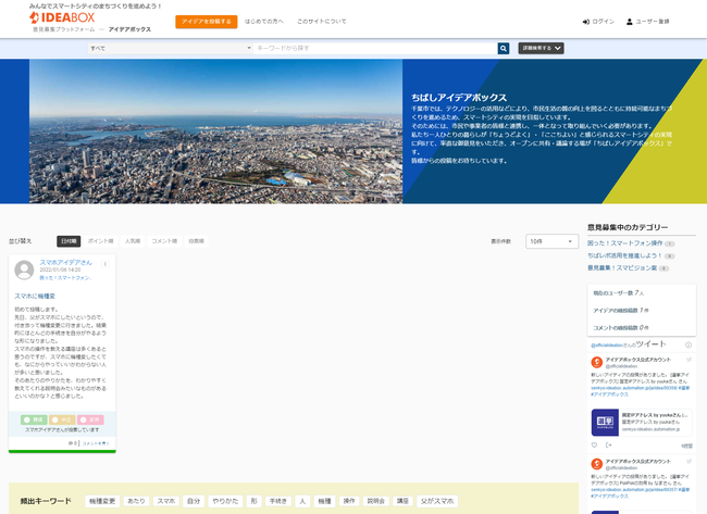 2022年1月6日にアイデアボックス2.0として全面リニューアルが完了しました事をご報告させて頂いておりましたが、千葉市様は公開型のアイデアボックス2.0の第1号ユーザーとして、運用を開始する事となりました。今回を皮切りに千葉市民の皆様からのご意見ご要望を踏まえながら、市民参画しやすい仕組みの運用を進めていきたいと考えております。
