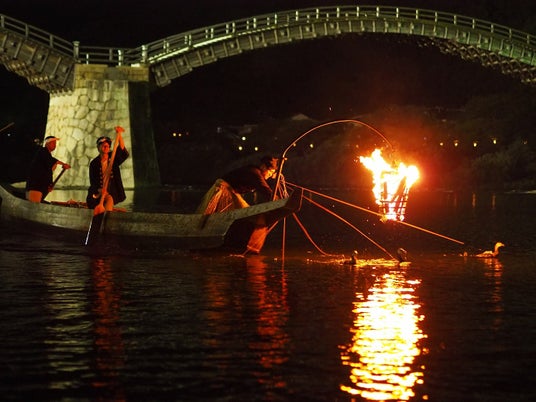 名勝・錦帯橋と間近に迫る鵜舟のかがり火、古式ゆかしい衣装に身を包んだ鵜匠が巧みな手縄さばきで鵜をあやつる、幻想的で神秘的な光景が楽しめる。