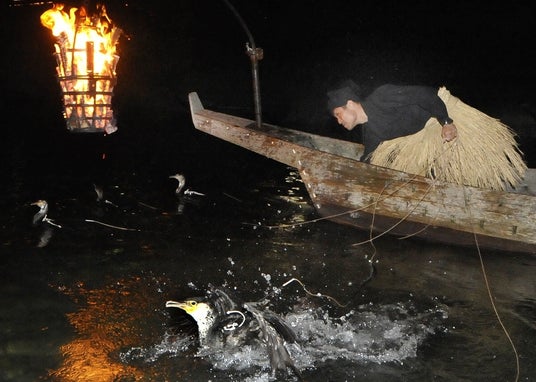 舟が近付くと、篝火に照らされた川面に鵜が泳ぎ、鮎を追う姿が見えてきます。