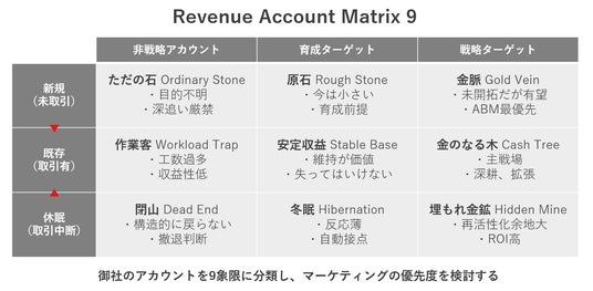 ▲RAM9(Revenue Account Matrix9)=ターゲットアカウントを9象限に分けて検討していくためのフレームワーク