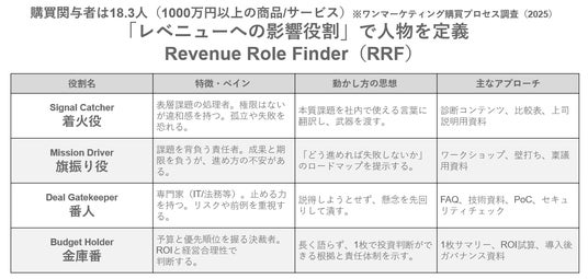 ▲RRF(Revenue Role Finder)=ターゲットアカウントに紐づくリードに対して、4つの役割に定義しペルソナを設計するフレームワーク