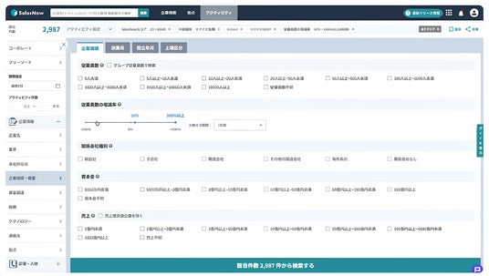 株式会社SalesNowは、BtoB企業の新規開拓を加速させるため、1,400万件超の企業データを収録したAI搭載企業データベースクラウド「SalesNow」を提供しています。採用・資金調達・従業員数推移など企業の"いま"の動きをリアルタイムに把握できるアクティビティ機能や、業界・財務・規模など多角的な条件での高精度ターゲティングにより、「誰に・なぜ・いまアプローチするか」の意思決定をデータで支援します。