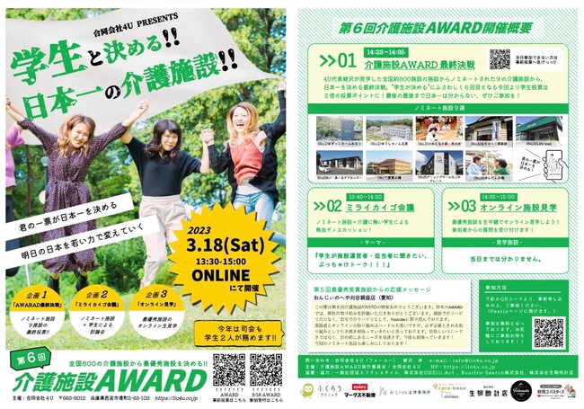 「イノベーション。誰かのために社会を面白くする!」をミッションに日本全国の介護施設の見学や施設運営サポートなど行う合同会社4U≪フォーユー≫(本社:兵庫県西宮市、代表:蛯沢渉)は、全国800の介護施設から業界に価値のある施設を表彰する「第6回介護施設アワード2022」を2023年3月18日(土)に開催いたしました!