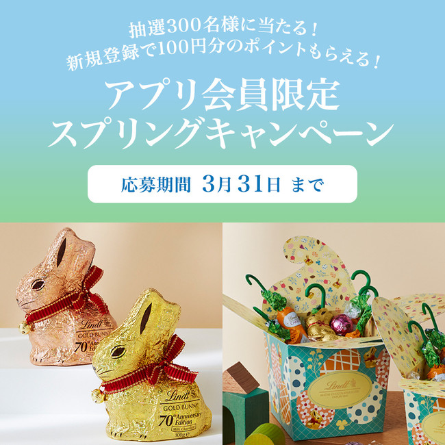 リンツ公式アプリをダウンロードのうえ、会員登録をしていただいている方の中から抽選で300名様へ「リンツ ゴールドバニー」をはじめとしたイースター限定のチョコレートなどをプレゼント。加えて、期間中に新規会員登録いただいた方にはもれなく、100円分のポイントをプレゼントいたします。