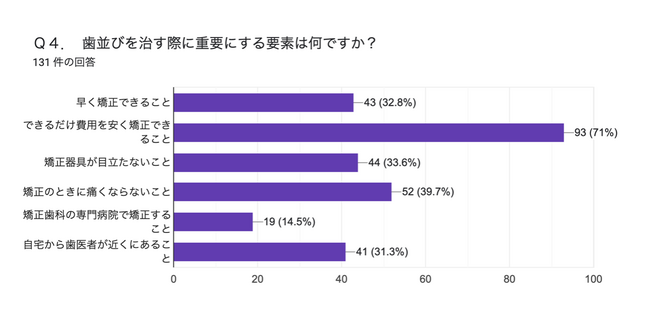 今回の調査で、約7割の人が自分の歯並びについて部分的・全体的に気になると回答しており、歯並びを治す際に重要視する要素を尋ねると、最も多いのが「できるだけ費用を安く強制できること(71%)」、次いで「矯正の時に痛みがないこと(39.7%)」、「早く矯正できること(32.8%)」でした。