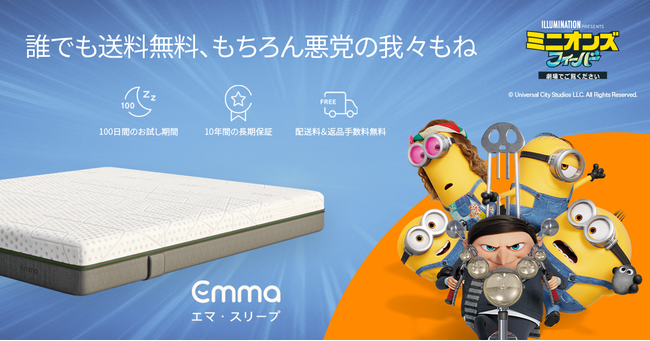 2022年7月8日(金)東京発 - エマ・スリープは、イルミネーション社およびユニバーサル・ピクチャーズ社と提携し、イルミネーション社の新作映画「ミニオンズ フィーバー』とのプロモーションキャンペーンを実施します。イルミネーション社の新作映画「ミニオンズ フィーバー」<7月15日(金)公開>のプロモーションキャンペーンは、仮に世界的な悪党のミニオンたちであっても、誰もが良質な睡眠をとることに値するというメッセージが込められています。