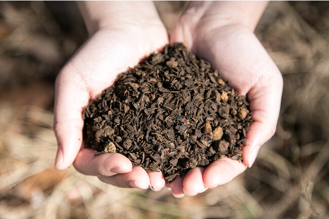 トマトを育てるための土地の栄養分となる堆肥は、黒川温泉旅館組合が生産しています。旅館から出る食品残さに、地域で使われていない未利用資源の落ち葉、もみ殻、米ぬか、赤土等を混ぜ合わせて約半年間かけて作ります。