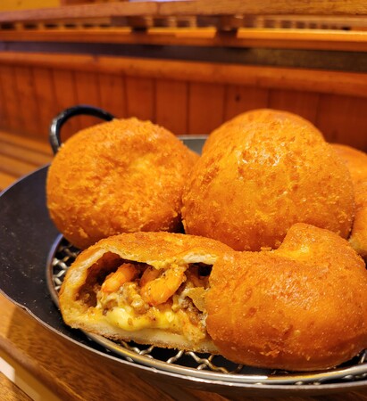 北海道の甘えびオイルを使用し、エビの身を包み上げた贅沢なカレーパンで、サクサクの衣の中からトロ~リとろけ出すフォンデュチーズをお楽しみいただけます。他にはない、ペンギンオリジナルのカレーパンをぜひご賞味ください。