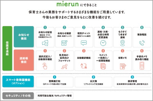 園と保護者のコミュニケーションサービス「mierun」とは「mierun」は、園と保護者間の連絡機能に特化した園向けのサービスです。