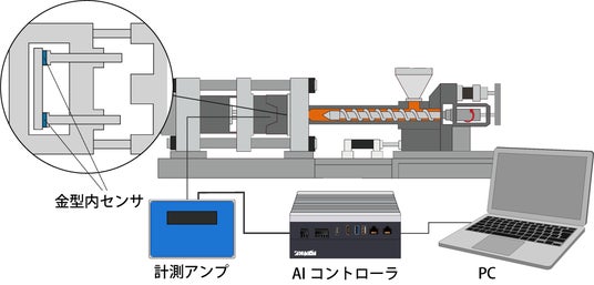 今回販売する「射出成形AIシステム」は、AIを活用した良否判定機能と成形条件調整機能を備えています。当社の樹脂圧力計測システムに株式会社MAZIN製のAIコントローラを組み合わせることで、その機能を発揮します。