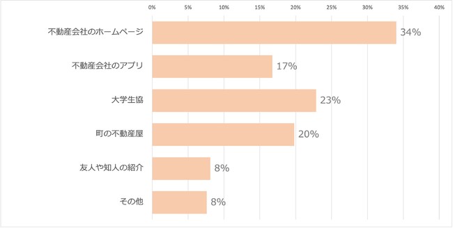 下宿の割合が40%であったのに関わらず、「徒歩のみ」の割合が12%であることから、下宿先の物件探しにおいて、徒歩圏内を意識する人はそこまで多くないようだ。1つ前の質問結果と合わせてみると、交通手段を問わず通学時間30分以下を目安に、物件を探している学生が多いと考えられる。■大学生が物件探しをする際に利用する方法