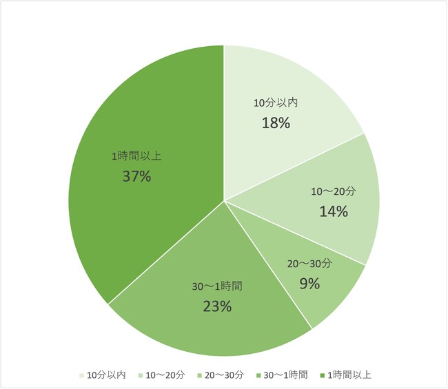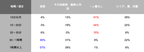大学生の住居形態について調査するために、「Q1.現在住んでいる家は?(N=500)」という質問をしてみた。結果は、実家暮らしが6割、一人暮らしが3割、その他(寮やシェアハウス)が1割となった。「実家:下宿」と考えると、おおむね「6:4」という数値になるようだ。男女で大きな違いはなく、数値はどちらも約6:4となった。■大学生の通学時間