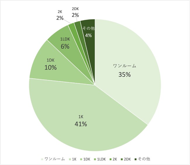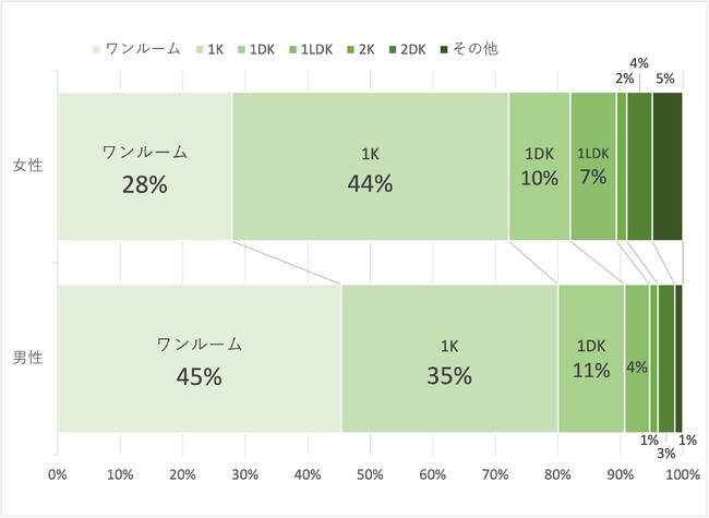 家賃に関する調査では、男女別の数値にやや違いが生まれた。女子大学生の方が男子大学生に比べて、家賃が高い傾向にある。女子学生の場合、物件探しの際にセキュリティ面や衛生面を考慮することから、自然と家賃の平均が男子学生よりも高くなってしまうのだろう。●大学生の住居の間取り
