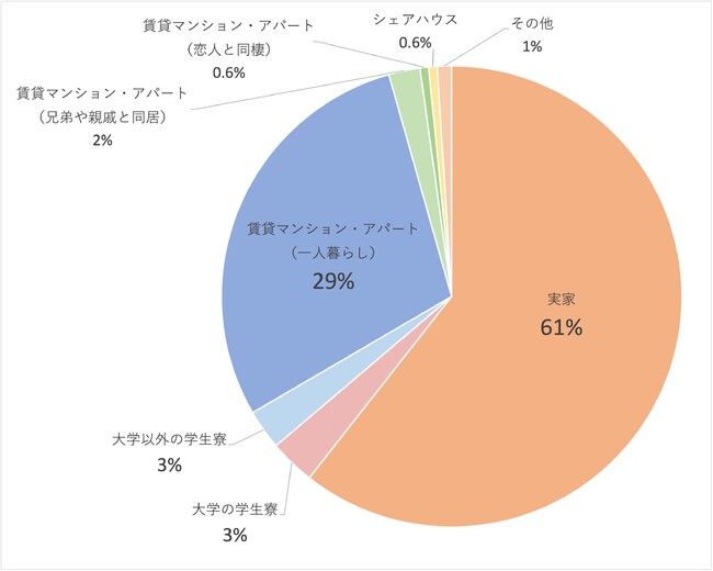 ■背景当社は、2014年にサービスを開始した大学生専門の協賛プラットフォーム「ガクセイ協賛」事業を皮切りに、人材・不動産・エンターテイメント・医療など10カテゴリの事業領域でインターネットを活用した送客プラットフォーム事業を展開しております。「ガクセイ協賛」の導入団体は現在では700大学6000団体を超えており、当社は、多くの学生の声を直接集めることができる強みを生かし、現代の学生の実態を通して新しい視点をご提案することを目的に調査事業を行っております。■調査概要調査期間:2023年03月17日(金)~2023年03月24日(金)調査対象:全国、ガクセイ協賛に登録する700大学の学生調査方法:インターネット調査回答者数:4年制・短期大学・専門学校を含む学生500名(女性:326・男性:174)■質問項目Q1.現在住んでいる家は?Q2.家から学校までの通学時間は?Q3.家から学校までの通学手段は?Q4.現在住んでいる家をどのように探しましたか?Q5.物件・部屋を選ぶ場合の条件について教えてくださいQ6.現在住んでいる家の家賃は?Q7.現在住んでいる家の間取りは?Q8.物件の周辺環境で重要だと思うものの上位3つを教えてくださいQ9.部屋づくりやインテリアにはこだわる方ですか?Q10.部屋づくりやインテリアで参考にしているものは?Q11.将来住んでみたい憧れの家は?■大学生の住居形態