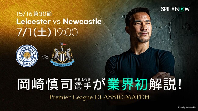 「SPOTV NOW」では、海外サッカーファンの皆さまにシーズンを問わずいつでもプレミアリーグをお楽しみいただくため、オフシーズン期間中にプレミアリーグの歴代名勝負をフルマッチで毎週お届けするオリジナル企画「Premier League CLASSIC MATCH」を有料会員限定コンテンツとして配信中です。今回1番の目玉企画として、日本代表で歴代3位の得点記録を持ちプレミアリーグ優勝も経験している岡崎慎司選手に、業界で初めてフルマッチの解説者としてご出演頂きます。岡崎選手がバイシクルシュートを決めた [15/16シーズン] プレミアリーグ第30節 レスター・シティvsニューカッスル戦を7/1(土) 19:00より、SPOTV NOW有料会員ならびにU-NEXTで「SPOTV NOWパック」をご購入頂いているお客様へお届けします。
