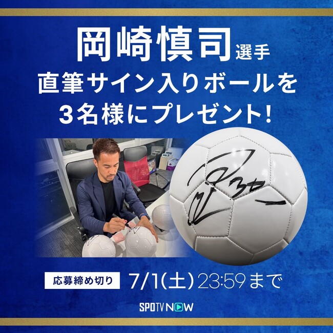 さらに岡崎慎司選手の初解説を記念して、ご本人の直筆サイン入りボールが当たるプレゼントキャンペーンを実施します。詳しくはSPOTV NOW公式Twitterをご確認ください。