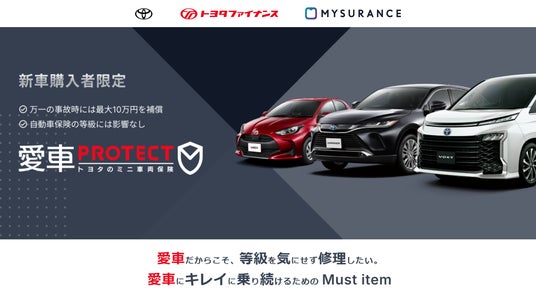トヨタファイナンス株式会社(本社:愛知県名古屋市、代表取締役社長:西 利之、以下「TFC」)と損害保険ジャパン株式会社(本社:東京都新宿区、代表取締役社長:石川 耕治)の子会社で少額短期保険業を営むMysurance(マイシュアランス)株式会社(本社:東京都新宿区、代表取締役社長:桐山 正弘、以下「Mysurance」)は、2023年8月より一部のトヨタ販売店(以下「先行販売店」)を通じて「愛車PROTECT トヨタのミニ車両保険」(以下「本保険」)を先行販売してきました。今般、多くのお客さまや先行販売店の皆さまからご好評をいただいたことを受け、取扱販売店を全国のトヨタ販売店に順次拡大してまいります。