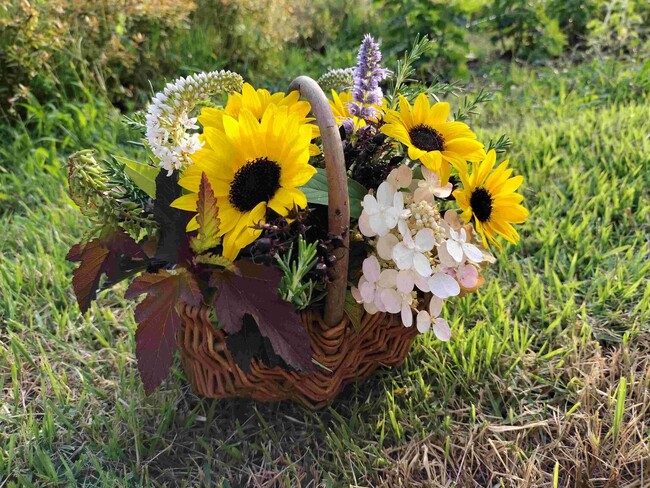 里山をバックにバラテラスに咲き誇るヒマワリを自分で選んで摘み取ってアレンジメントを作る体験。夏の日差しを浴びて、元気いっぱいなビタミンカラーのお花をご自宅でもお楽しみください。