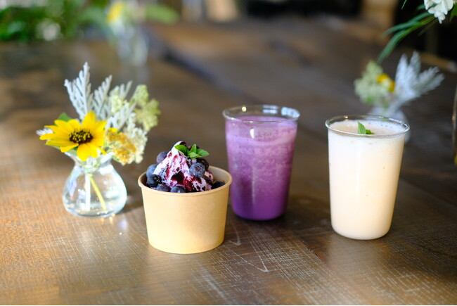 入園チケット不要で利用できるマーケット内のローズファームカフェでは、地元の果物を使ったドリンクメニューをご用意。茨城メロンのソフトクリームに加え、クインシーメロンを贅沢に使ったスムージーやベリーミックススムージーもぜひ夏に味わいたい旬のメニュー。