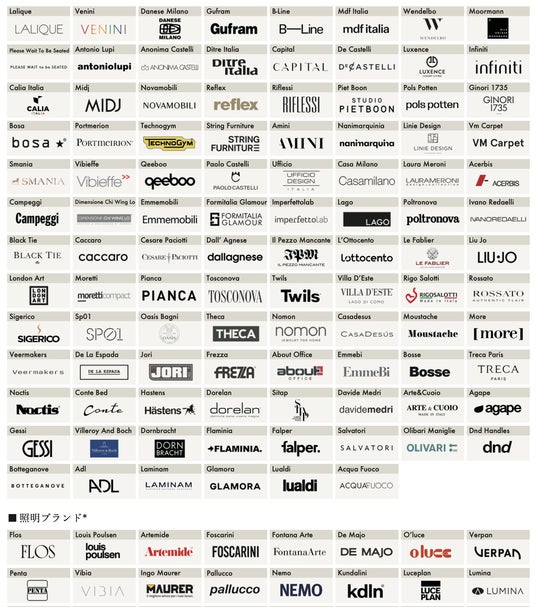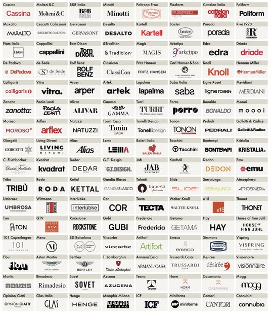 &Tradition/101 Copenhagen/About Office/Acerbis/ADL/Agape bagni/Agape Casa/Alf Da Fre/Alias/Alivar/Alma De Luce/Altek/Amini/Angelo Cappellini/Anglepois/Antonio Lupi/Apparatus/Arclinea/Arflex/Arketipo/Armani Casa/Armet/Arper/Arte & Cuoio/Arte Brotto/Arte Veneziana/Artek/Artelinea/Artemide/Articolo/Asnaghi/Aster/Astro Lighting/Atmosphera/Audo/Axolight/Azucena/B&B/B&B Outdoor/Baccarat/Baleri/Balsan/Barazza/Barovier&Toso/Baxter/Baxter Outdoor/BD Barcelona/Bentley/Berti/Besana/Black_Tie/B-Line/Boca Do Lobo/Bocci/Bomma/Bonaldo/Bontempi/Bosa/Bosh/Bosse/Botteganove/Bretz/Brokis/BSD/Busnelli/Caccaro/Calia Italia/Calligaris/Campeggi/Cantori/Capital/Cappelletti/Cappellini/Carl Hansen/Casa/Casadeus/Casamania & Horm/Casamilano/Cassina/Catellani & Smith/Cattelan/Cava Divani/CC Tapis/Ceccotti/Cesare Paciotti/Cherner/Chi Wing Lo/Christopher Boots/Cielo Ceramiche/Cierre/Cinquanta3/ClassiCon/Clei/CLM/Connubia/Constantini Pietro/Contardi/Conte Casa/Corbetta/Cprn/CTO Lightning/CVL/Dall' Agnese/Dallagnese/Davide Groppi/Daylight/De Castelli/De Padova/De Sede/Dedar/Dedon/DeLonghi/Desalto/Desiree/Dimensione Chi Wing Lo/Ditre italia/Dnd Handles/Dolce&Gabbana/Dolmen/Dorelan/Dornbracht/Draenert/Driade/Dunavox/e15/Eco smart/Edg Piante Artificiali/Edra/Eforma/Eichholtz/Emmemobili/Emu/Ercuis/Established and Son/Estel Casa/Estiluz/Ethimo/Exteta/Fairytale/Falper/Fendi Casa/Fermob/Ferri/Fhiaba/Fiam/Finn Juhl/Flaminia/Flexform/Flos/Flou/Foglie D'Oro/Fontana Arte/Formitalia/Fortuny/Foscarini/Foster/Frato/Fredericia/Frezza/Frigerio/Frigo2000/Fritz Hansen/Gaggenau/Gallotti & Radice/Gamma/Gan/Gandia Blasco/Gervasoni/Gessi/Getama/Ginger & Jagger/Ginori 1735/Gio Pagani/Giorgetti/Giorgio Collection/Giulio Marelli/Glamora/Glas Italia/Globo/Gloster/GT Design/Gubi/Gufram/Halley/Hastens/Hay/Henge/Hermes/House of Finn Juhl/Humanscale/I 4 Mariani/Icam/Il Pezzo Mancante/Imola Ceramiche/Imperfetto Lab/Infiniti/Ingo Maurer/Inkas/Italamp/Ivano Redaelli/J. Adams & Co/Jacuzzi/Janus et Cie/Jonathan Adler/Jori/Kartell/Kashtall/Kastel/Kettal/Knoll/Kristalia/Kuntalini/La Cividina/La Faenza/Lago/Lalique/Lapalma/Lasvit/Laura Meroni/Lc Stendal/Le Creuset/Le Fablier/Le Porcellane Firenze 1948/LedsC4/Lee Broom/Lema/Liebherr/Light4 - Murano Luce/Ligne Roset/Linie Design/Liu Jo/Living Divani/LODES/London Art/Longhi/Loro Piana/L'ottocento/Louis Poulsen/Lualdi/Luceplan/Lumina/Luxence/Luxxu/Magis/Malerba/Marelli/Margaroli/Marset/Masiero/Mastrotto/Mattiazzi/Mavimatt/Maxalto/Md House/MDF/Meluzzi/Memphis Milano/Meridiani/Mezzo Collection/Midj/Miele/Milano Bedding/Miniforms/Minotti/Minotti Collezioni/Misura Emme/Modulnova/Mogg/Molteni&C/Montillo1980/Moooi/Moormann/More/Morelato/Moretti/Moroso/Munna/Nature Design/Natuzzi/Neff/Neff Smart/Nemo/Neutra/Nicoline/Nobonobo/Noctis/Nodo/Nodus Rug/Nomon/Noom/Novamobili/Oasis Bagni/Occhio/Olivari maniglie/Olive Groppo/Oluce/Opera Contemporary/Opinion Ciatti/Ozzio/Pacini & Cappellini/Pallucco/Pando/Paola Lenti/Paolo Castelli/Parachilna/Pedrali/Penta/Pianca/Piet Boon/Please wait to be seated/Point/Poliform/Polspotten/Poltrona Frau/Poltronova/Porada/Porro/Portmerion/Potocco/Pouenat/PP Mobler/Praddy/Prandina/Private Label/Prostoria/Pulpo/Qeeboo/Quadrifoglio/Quooker/Raynaud/Reflex/Rexa/Rigo Salotti/Rimadesio/Ritmonio/Ritzwell/Riva 1920/Robbe&Berking/Roche Bobois/Roda - Tuuci/Rogaska/Rolf Benz/Roll & Hill/Ronda/Rossato/Rossini/Rubelli/Rugiano/Saba Italia/Salvatori/Sans Souci/Scab/Secolo/Sellex/Siemens/Sigerico/Simmons/Sitap/Slamp/Slide/Smania/Sovet/SP 01/String Furniture/Tacchini/Talenti/Tapis Rouge/Technogym/Teckell/Theca/Thonet GTV - Gebrueder Vienna/Tom Dixon/Ton/Tonelli/Tonin Casa/Tooy/Tosconova/Tribù/Trizo/Trussardi Casa/Turri/Twils/Uffici/Unox/Veermakers/Venini/Verpan/Versace/Vibia/Villa d'este/Villeroy & Boch/Visionnaire/Vismara/Vispring/Vitra/Vittoria Frigerio/VM Carpet/Vondom/V-Zug/Walter Knoll/Wendelbo/Wittmann/Yomei/Zanotta/Zeus/Zieta