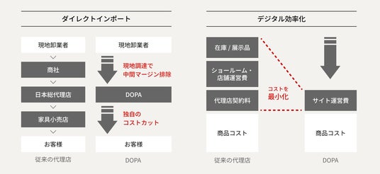 DOPAは契約に縛られない直輸入ビジネスを選択したことで、世界中の有名トップブランドを網羅した400社以上*におよぶラインアップを実現。これまでの代理店ビジネスの場合、ブランド同士が競合関係で店舗が点在していたのに対し、これからはDOPAにご相談いただくだけで、アジア最大級に充実したブランドの選択肢から妥協のない最適な商品をワンストップでお選びいただけます。