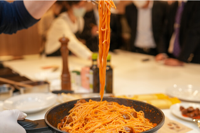 レシピはイシイのおべんとクン ミートボールとアルチェネロ有機スパゲッティ、基本の有機トマトソースを使用したミートボールパスタ。それぞれの製品の特徴を説明しながら、調理を行いました。デモンストレーションの合間にも、出席者からは調理や製品に関する質問が飛び交い、さらにミートボールやアルチェネロ製品について知識を深める時間となりました。