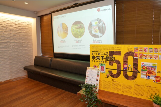 イベントは、石井食品の会社紹介から「イシイのおべんとクン ミートボール」のこだわりをお伝えするコーナーからスタート。原料選定から製造管理、さらには時代の変化や技術の進歩に合わせて大小50回以上の改良を重ねていることを説明し、商品を食べていただく消費者の皆さまに、よりおいしく、より安心安全に食べてもらいたい思いをお伝えしました。