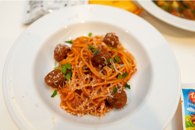 試食では、イシイのおべんとクンミートボールと石井食品の常温保存ミートボール、さらにできたてのミートボールパスタのほか、同じくコラボレシピのミートボールミネストローネをご賞味いただきました。製品について知ったあとで食べるミートボールの味わいはこれまでと一味違ったかもしれません。