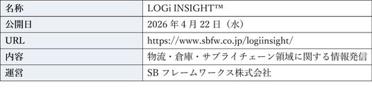 SBフレームワークス株式会社(本社:東京都中央区、代表取締役 社長執行役員:菅野 信義、以下「当社」)は、物流・倉庫・サプライチェーン領域に関わるビジネスパーソン向け専門メディア「LOGi INSIGHT(TM)」を、2026年4月22日(水)に公開します。