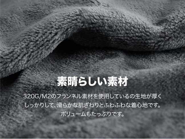 滑らかな肌触り、素肌で触れたふわふわの柔らかさ。高密度の極細繊維「フランネル」を使用しているので、暖かい空気をため込み、ふんわりあたたかく包みこまれるような着心地です。