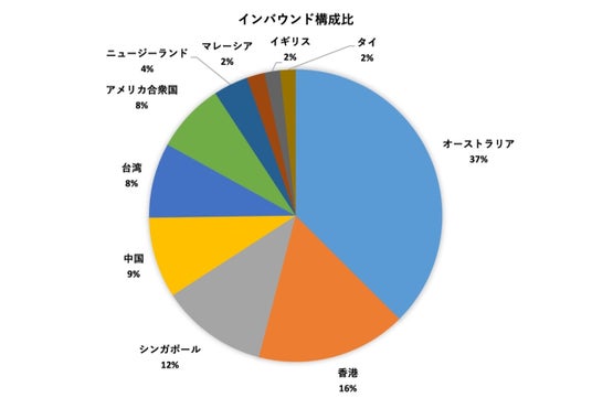 下図は2月末までに「エイブル白馬五竜」を訪れたインバウンド客の国別比率です(*2)。オーストラリアが37%と最も多く、続いて香港16%、シンガポール12%、中国9%、台湾8%、アメリカ8%となっています。ヨーロッパ圏からは多くはなく、中華・アジア圏からの来客が大半を占めています。白馬エリア全体としてオセアニアからの集客には成功しているため、白馬五竜としては中華・アジア圏向けのプロモーションに力を入れており、その結果がしっかりと表れた形になりました。