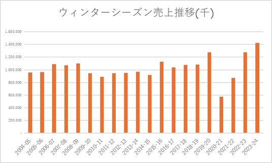 株式会社五竜の過去20年間の売上推移(ウィンターシーズン前半の11~2月で比較)