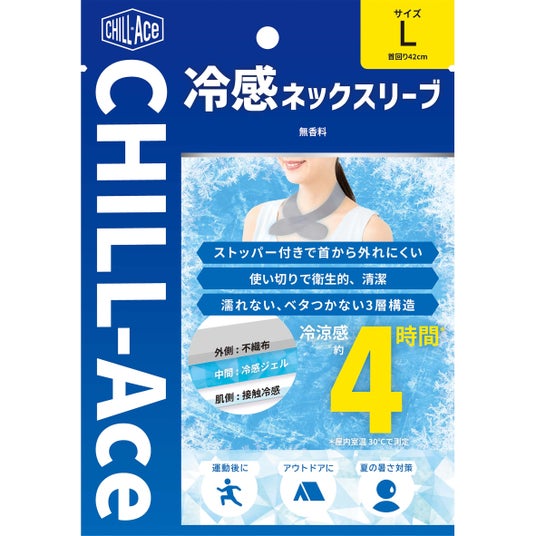 CHILL-Ace(チルエース)は、水や冷蔵・冷凍を必要とせず、開封後すぐに首元に装着できる冷感ネックスリーブです。薄く柔らかい不織布素材を採用しており、作業着や制服の首元に装着しても違和感が少なく、作業の妨げになりにくい設計となっています。