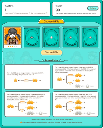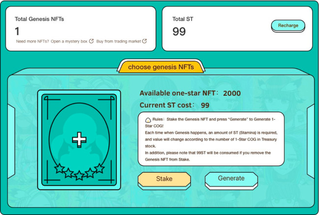 Cuty Owl GirlsのジェネシスNFTの所有者は、COGトレジャリーに在庫がある限り99 STを消費(STは毎日最大値99まで回復)することで毎日1点の★1のNFTを生成できます。