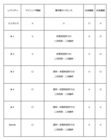 Cuty Owl Girlsの★1~★2のNFT所有者には所有する各作品の著作権を非営利目的または二次創作目的で利用するライセンスが付与されます。★3~★5のNFTおよびシークレットレアのNFT所有者にはさらに営利目的で著作権を利用するライセンスも付与されます。