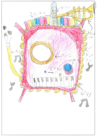 世の中の困ったことを”楽器”が解決するという発想、汚れた空気を”楽器”がきれいにするというアイデアが大変ユニークで、未来の楽器にふさわしいと思いました。いろんな種類の楽器が登場していたり、タンバリンのシンバル部分など細かい書き込みが丁寧にされているところも評価が高かったです。今にも動き出しそうな楽しい雰囲気が作品から溢れでていますね。どんな音楽が奏でられているのか、ぜひ聴いてみたいです♪