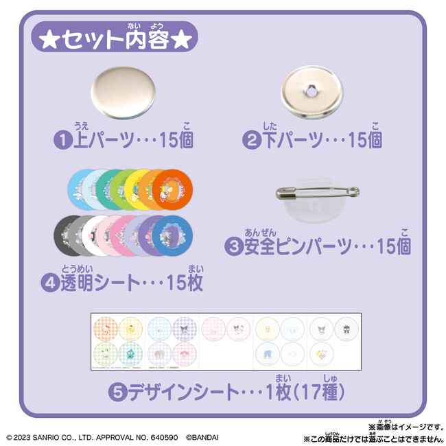 セット内容は、缶バッチ作成のための上下パーツ・安全ピンパーツが各15個と、デザインシート・透明シートです。