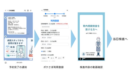 川村病院ではMed-Wellと同時に株式会社OPERe(本社:東京都港区、代表取締役:澤田優香)が提供する患者コミュニケーションシステム「ポケさぽ」を導入し、内視鏡検査の予約から検査内容の説明まで両社のサービスをひとつのLINEアカウント上で一貫して完結できるようになりました。