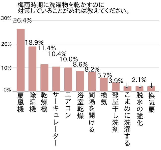 他にも風・温風・空気の流れで乾かす対策として、乾燥機(11.4%)、サーキュレーター(10.4%)、エアコン(10.0%)、浴室乾燥(8.6%)、換気(5.7%)、換気扇(2.1%)等がありました。